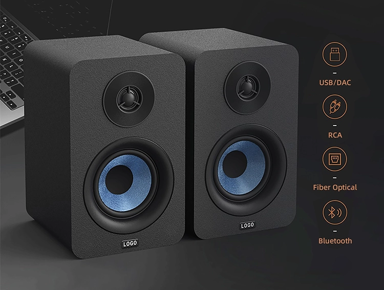 2.0 dual channel HI-FI Bluetooth bookshelf speaker provides clean and clear sound quality. 50W high-power high-quality sound, allowing you to enjoy a cinema level audio-visual feast. In addition, the main unit of the bookshelf speaker is equipped with multiple input interfaces such as RCA, fiber optic, USB, and supports Bluetooth wireless connection, compatible with various input devices, and has high scalability.
