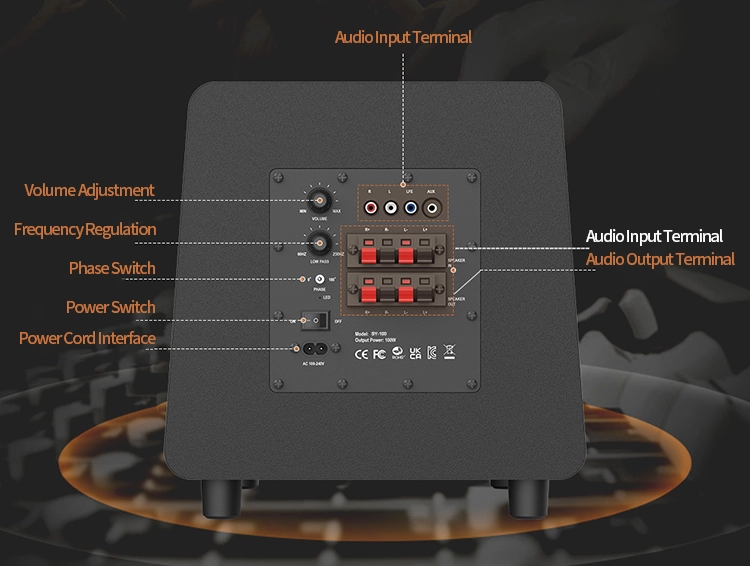 This 100W Hi-Fi wired subwoofer features a high-performance DAC decoding chip and an 8-inch turbo-charged bass driver that delivers rich, deep low frequencies. The low-noise bass reflex port effectively reduces airflow noise, resulting in fuller and deeper bass reproduction. Equipped with multiple input and output interfaces, it supports a wide range of audio sources. Rear adjustment knobs for volume, frequency, and phase allow flexible tuning of the sound field, providing high-fidelity audio performance for various listening environments.