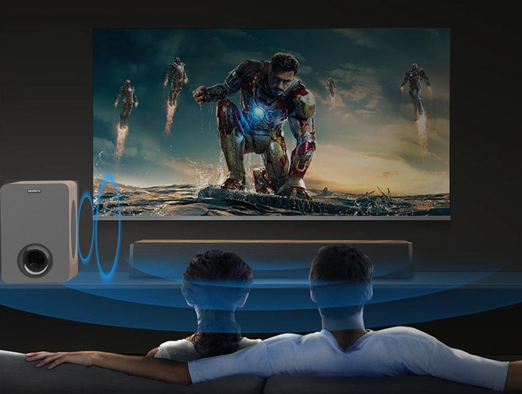 Equipped with a 60W soundbar and a 60W deep subwoofer, featuring two full-range speakers and two bass reflex tubes, it accurately reproduces every detail from low to high frequencies.