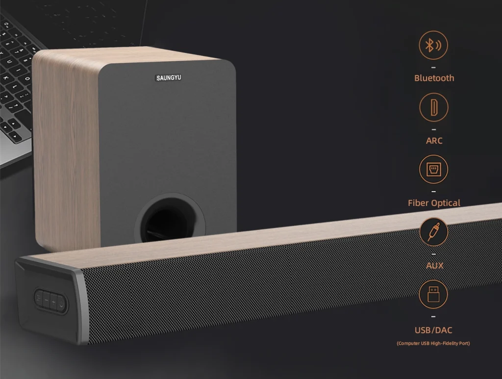 Elegant Wood-Grain Soundbar with Powerful Subwoofer